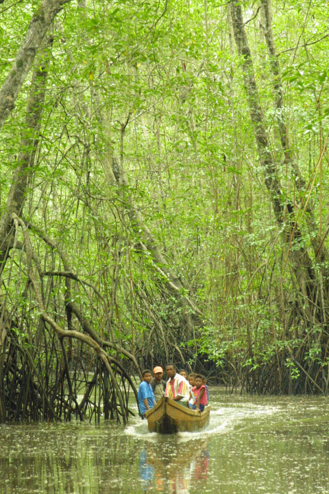 Villagers living within the Esmeraldas travel by hand-hewn fishing boats, negotiating the twisting waterways - rich with marine life.
