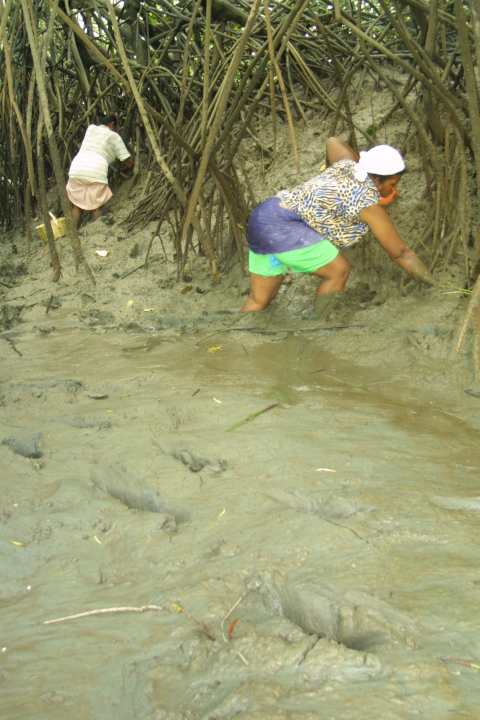The women pictured here search for clams, mussels and oysters, which provide food for the village.